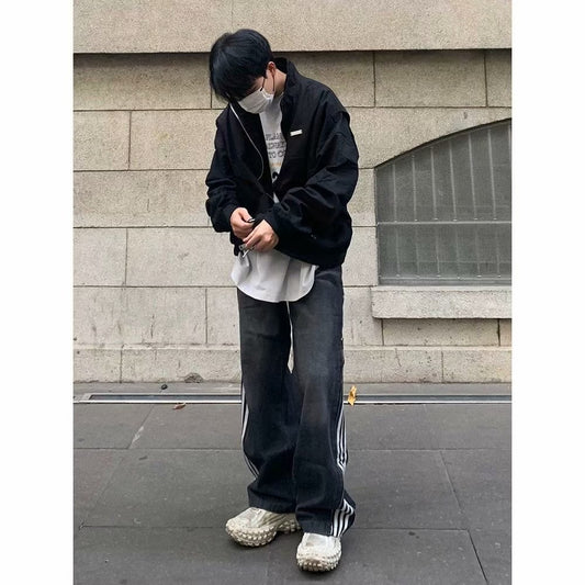 Sports Washed Striped Gray Wide Leg Leisure Jeans