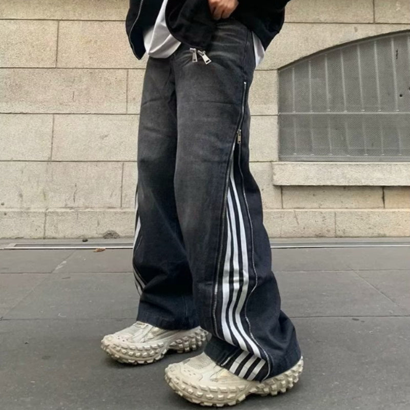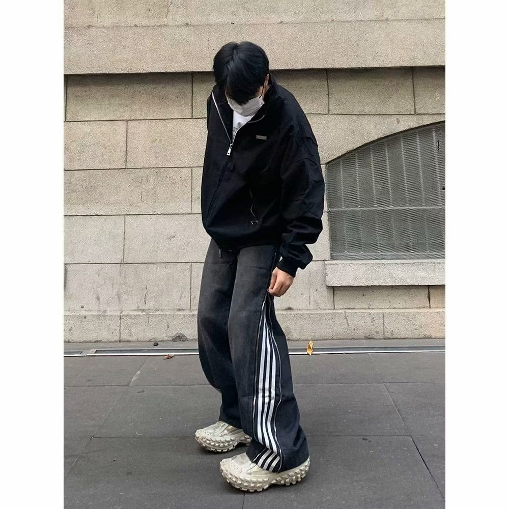 Sports Washed Striped Gray Wide Leg Leisure Jeans